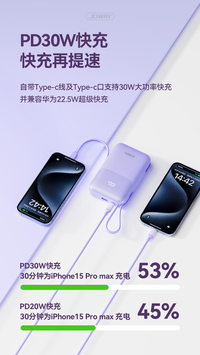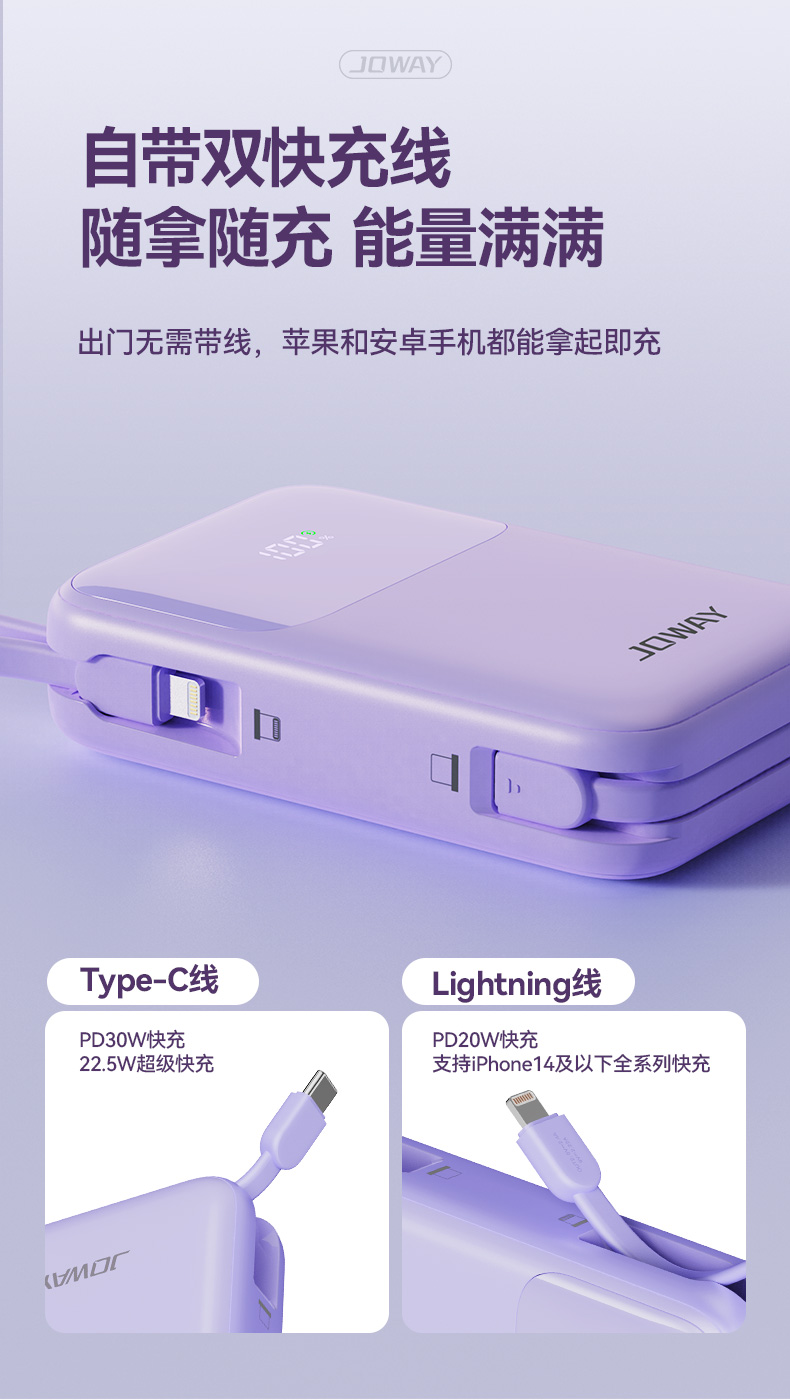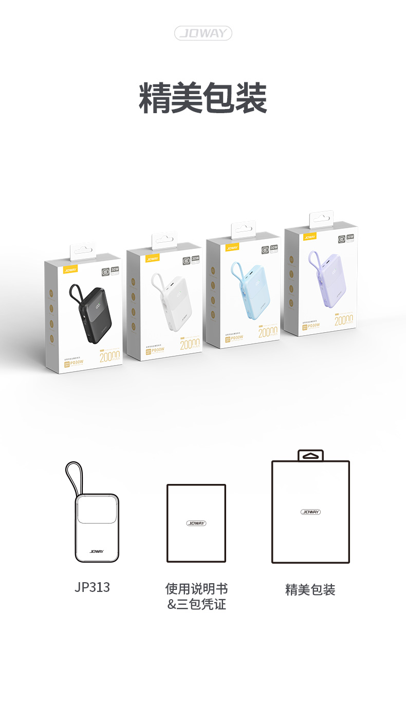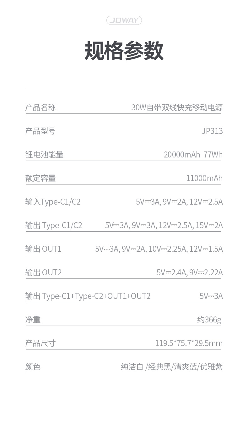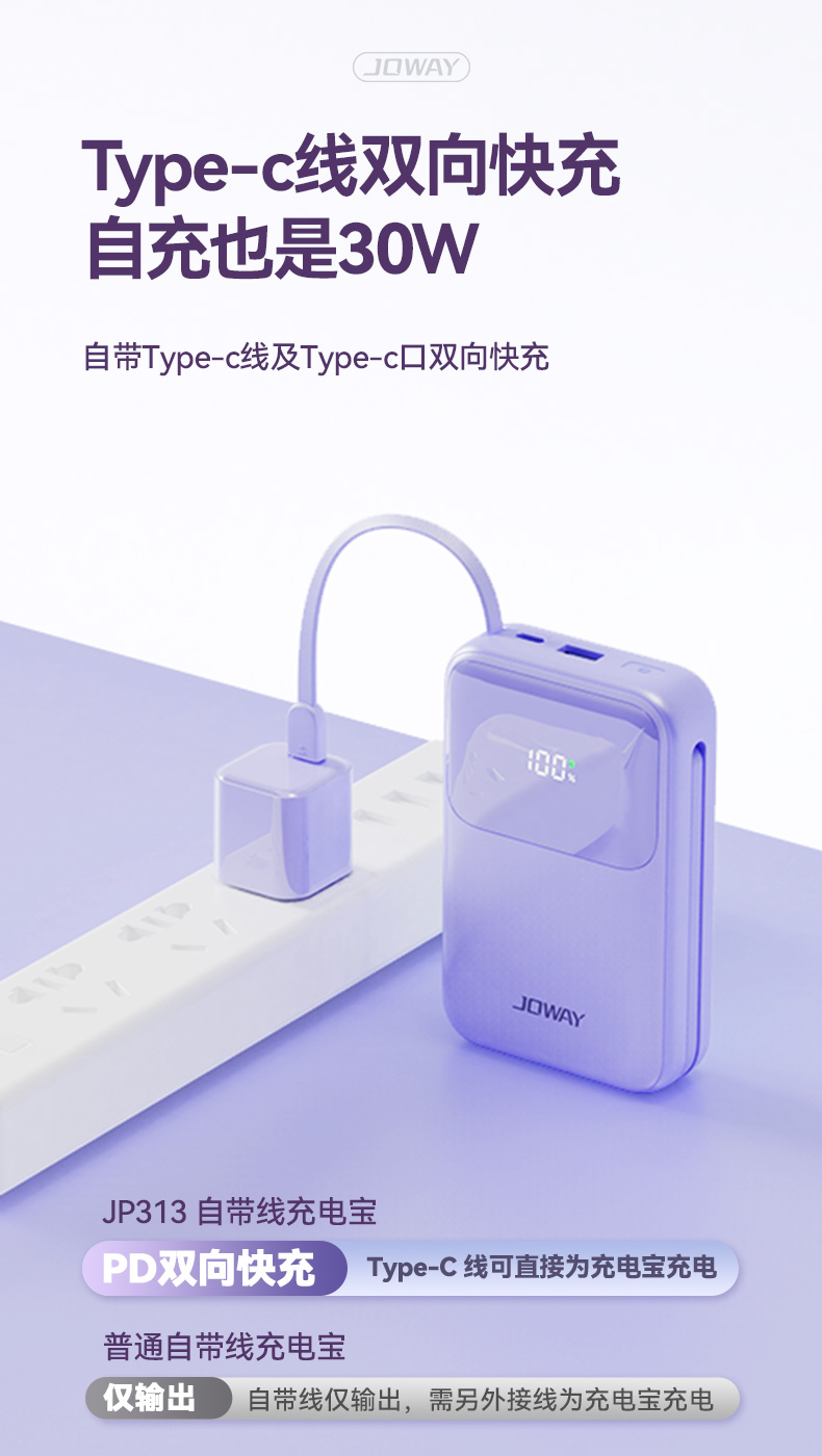 名稱:JP313 30W自帶雙線快充移動(dòng)電源